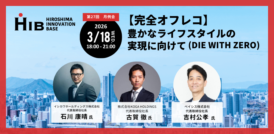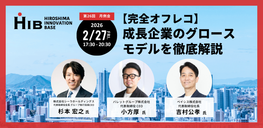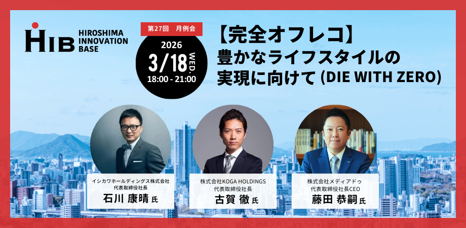 そこでこの度、起業家が起業家を産み育てる環境を創り、広島県の活性化を推進することを目的として広島イノベーションベース(以降、HIB)を設立する。